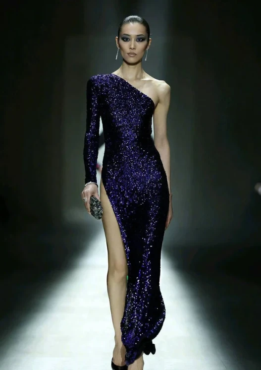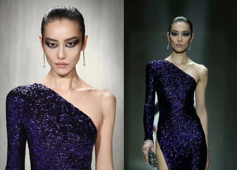 Trong lần xuất hiện này, Lưu Văn khoác lên mình thiết kế váy tím sequin lấp lánh với đường cắt xẻ táo bạo tới tận hông. Chi tiết lệch vai kết hợp cùng tà váy xẻ cao không chỉ tôn vinh triệt để đôi chân dài trứ danh mà còn tạo điều kiện để nữ siêu mẫu phô diễn những bước đi uyển chuyển nhưng đầy dứt khoát.