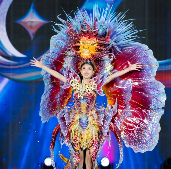 At the same time, at the Carnival Show, the representative of the host Phuong Linh also faced great difficulties. She appeared in the costume "Carp turned into a dragon" by designer Nguyen Duy Hau, weighing more than 15kg, of which the headgear was about 7kg. Stylist Thuan Tu said that Phuong Linh had to bear this weight for more than two hours before the performance. When performing, the weather in Da Lat was cold at about 16 degrees Celsius and the wind was strong, plus high heels of more than 10 cm made it difficult for Phuong Linh to keep her balance. Even the back wing suddenly broke, making her wobble for a few seconds, but then regained her demeanor to complete the contest.