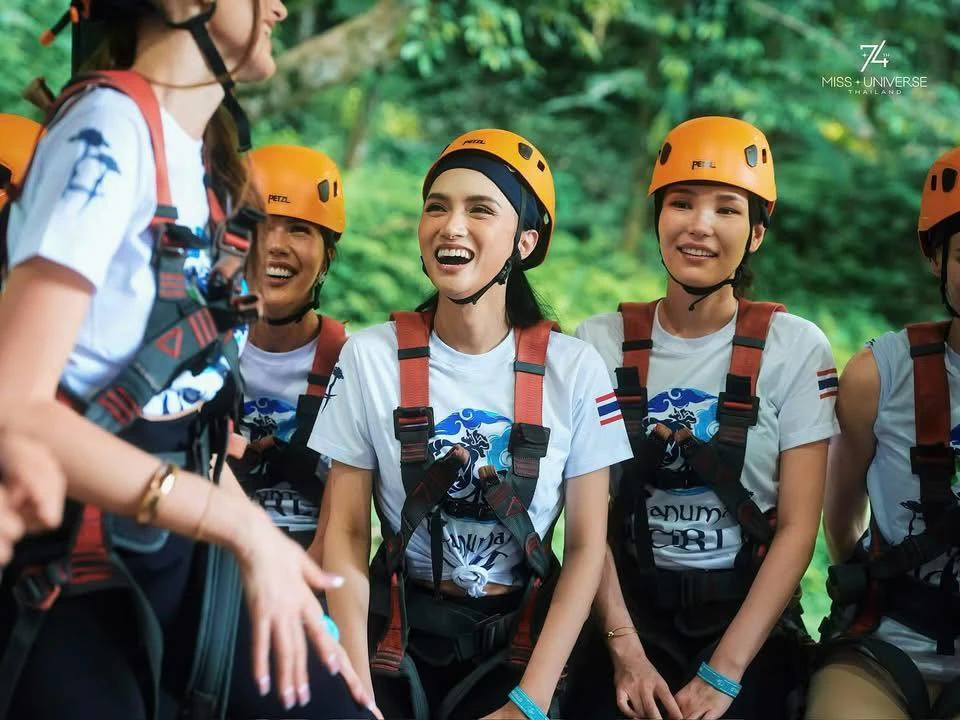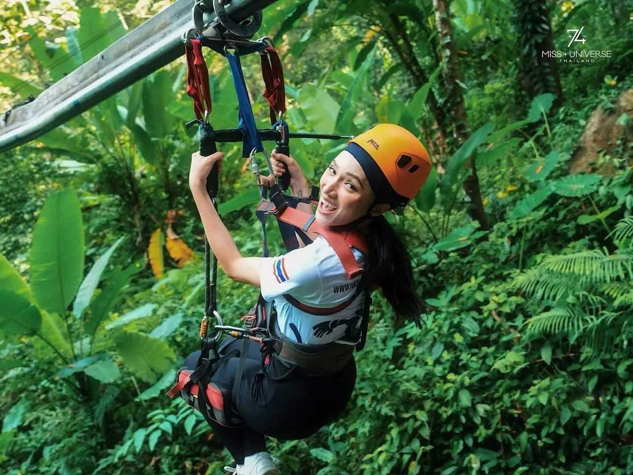 In contrast to that unsynchronized picture, Vietnam's representative - Huong Giang - became a highlight when she not only participated in all activities, but was also assigned a special task: being the backstage MC during the zipline experience with the contestants at Hanuman World Eco Park in Phuket. This is one of the most exciting and anticipated activities at Miss Universe 2025, when the contestants are challenged with courage on an 800-meter long slide, with an average speed of about 40 km/h, crossing the majestic tropical forest of Thailand.