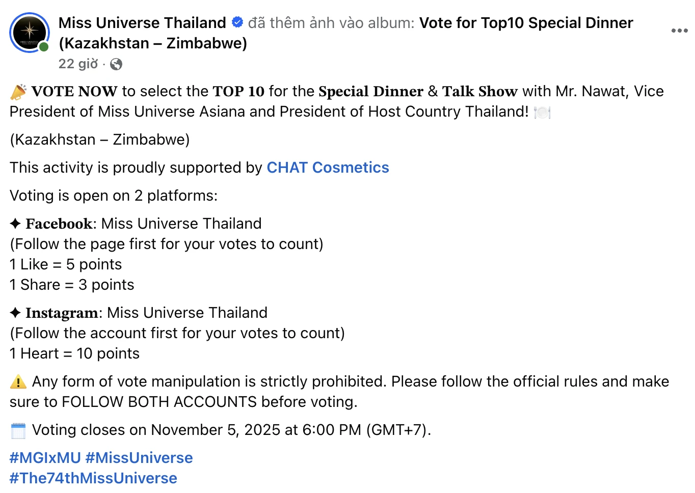 Specifically, Mr. Nawat 's side has launched an online voting campaign called "Dinner and Talk Show Special", which calls on the audience to interact with the photos of the contestants on the Miss Universe Thailand fanpage. The top 10 contestants with the highest number of interactions will have a dinner and private exchange with Mr. Nawat.