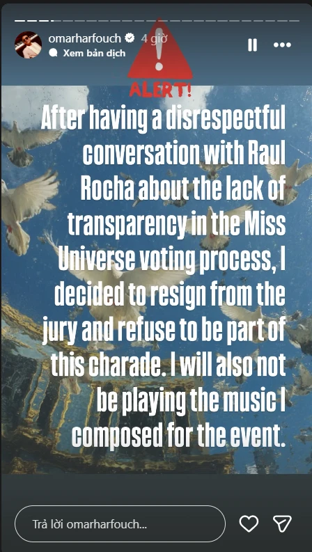 Chỉ còn ít ngày nữa là đến Đêm chung kết Miss Universe 2025, nhưng cuộc thi đã bị chấn động bởi quyết định gây sốc của một thành viên Ban Giám khảo chính thức. Tối khuya ngày 18/11, nhạc sĩ, nhà hoạt động xã hội nổi tiếng Omar Harfouch đã công khai tuyên bố từ chức và từ chối trình diễn ca khúc do chính ông sáng tác, tất cả vì cáo buộc thiếu minh bạch nghiêm trọng trong quy trình tuyển chọn Top 30 thí sinh.