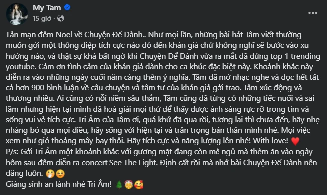 Đáng chú ý, nữ ca sĩ tiết lộ cô đã dành thời gian đêm muộn để đọc hết hơn 900 bình luận của khán giả. Trước những câu chuyện buồn vui của người hâm mộ, Mỹ Tâm không khỏi xúc động: "Tâm thương nhiều. Ai cũng có nỗi niềm sâu thẳm". Sự kết nối giữa nghệ sĩ và khán giả vào khoảnh khắc thiêng liêng của đêm Noel cho thấy Mỹ Tâm luôn đặt âm nhạc và sự thấu cảm lên hàng đầu, thay vì những ồn ào đời tư.