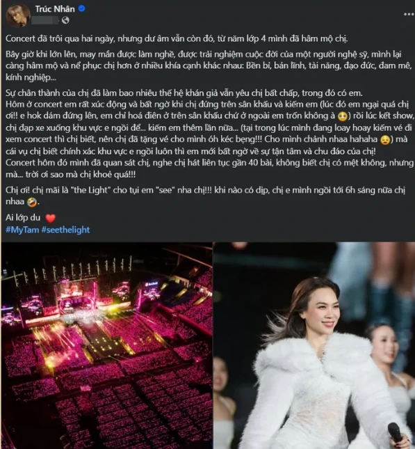 Sức nóng từ Live Concert "See The Light" của Mỹ Tâm tại Mỹ Đình tối 13/12 vẫn chưa có dấu hiệu hạ nhiệt. Dù đêm nhạc tại Sân vận động Quốc gia Mỹ Đình đã khép lại được hai ngày, nhưng đối với Trúc Nhân, những dư âm về thị giác và thính giác vẫn còn vẹn nguyên. Trên trang cá nhân, nam ca sĩ "Có không giữ mất đừng tìm" đã có những chia sẻ đầy chân thành, phác họa lại chân dung một Mỹ Tâm không chỉ rực rỡ dưới ánh đèn sân khấu mà còn tử tế ở đời thực.