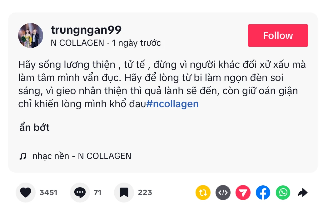 Instead of speaking up, sharing or commenting on anything about the incident, Ngan Collagen chose to be absolutely silent. On her personal page, she still regularly posts cosmetic advertising videos, shares beauty secrets and familiar collagen drinking clips. There was no indication that she was affected or bothered by the wave of noise that surrounded her. In the midst of her name being constantly called, Ngan Collagen kept a strangely calm attitude, seemingly not wanting to be caught up in the center of the storm.