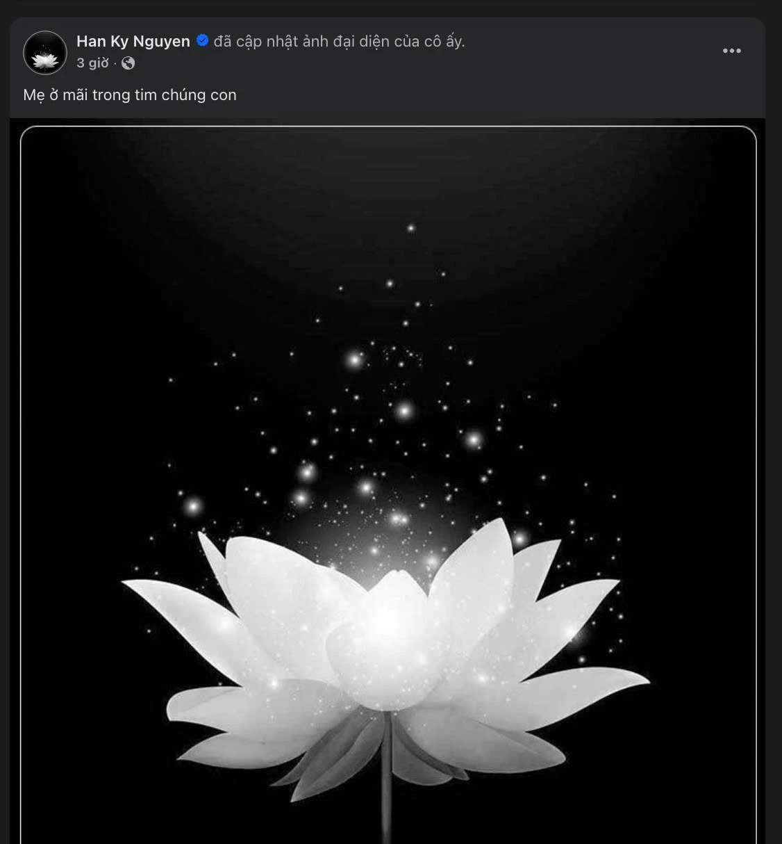 Model Ky Han recently moved many colleagues and fans when she shared the sad news of her mother's passing. On her personal page, she changed her profile picture to a white lotus flower on a black background to express her grief.