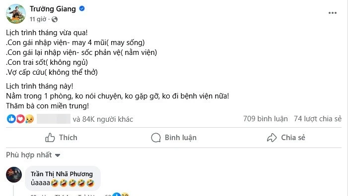 Tình hình sức khỏe bất ổn của Nhã Phương chỉ là một phần trong chuỗi sự kiện không may xảy ra với gia đình Trường Giang trong cùng một tháng. Trường Giang cũng từng chia sẻ trên trang cá nhân về việc vợ anh cấp cứu vì không thể thở, đồng thời tiết lộ các thành viên khác trong gia đình cũng liên tục phải vào bệnh viện.