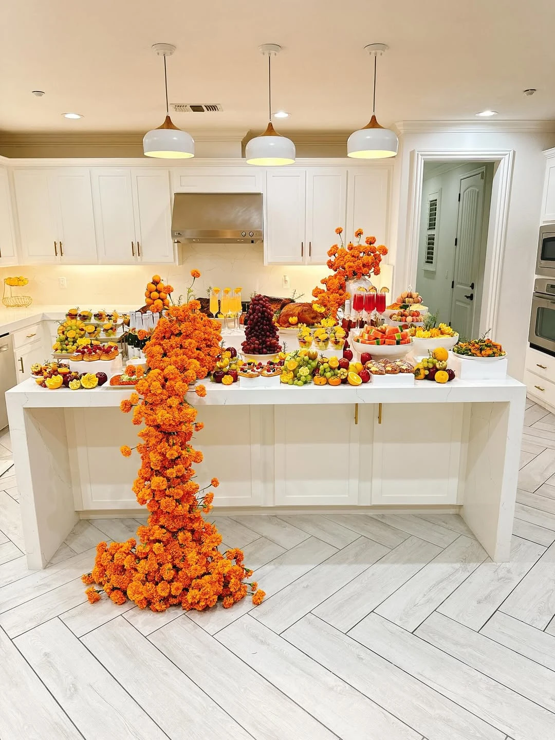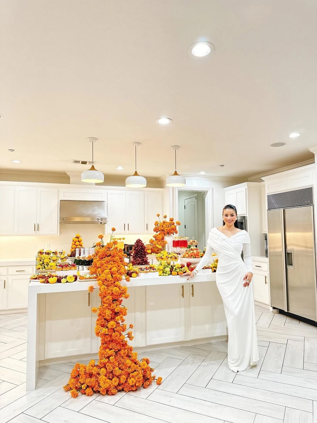 In the warm atmosphere of Thanksgiving, Pham Huong â Miss Universe Vietnam 2015 â once again became the focus of attention when posting a series of pictures of a sophisticatedly prepared banquet table in a 1000m² villa in the US. The beauty appeared in an elegant white dress, standing out in the middle of the spacious kitchen space with the main white tone. The highlight that makes the public admire is the banquet table decorated with a brilliant orange flower strip, winding from the table to the floor, creating an impressive visual effect like a work of art.