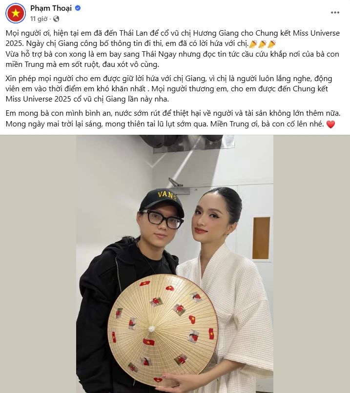 Trên trang cá nhân, Phạm Thoại viết: "Mọi người ơi, hiện tại em đã đến Thái Lan để cổ vũ chị Hương Giang cho Chung kết Miss Universe 2025. Ngày chị Giang công bố thông tin đi thi, em đã có lời hứa với chị. Vừa hỗ trợ bà con xong là em bay sang Thái ngay. Xin phép mọi người cho em được giữ lời hứa với chị Giang, vì chị là người luôn lắng nghe, động viên em vào thời điểm em khó khăn nhất."
