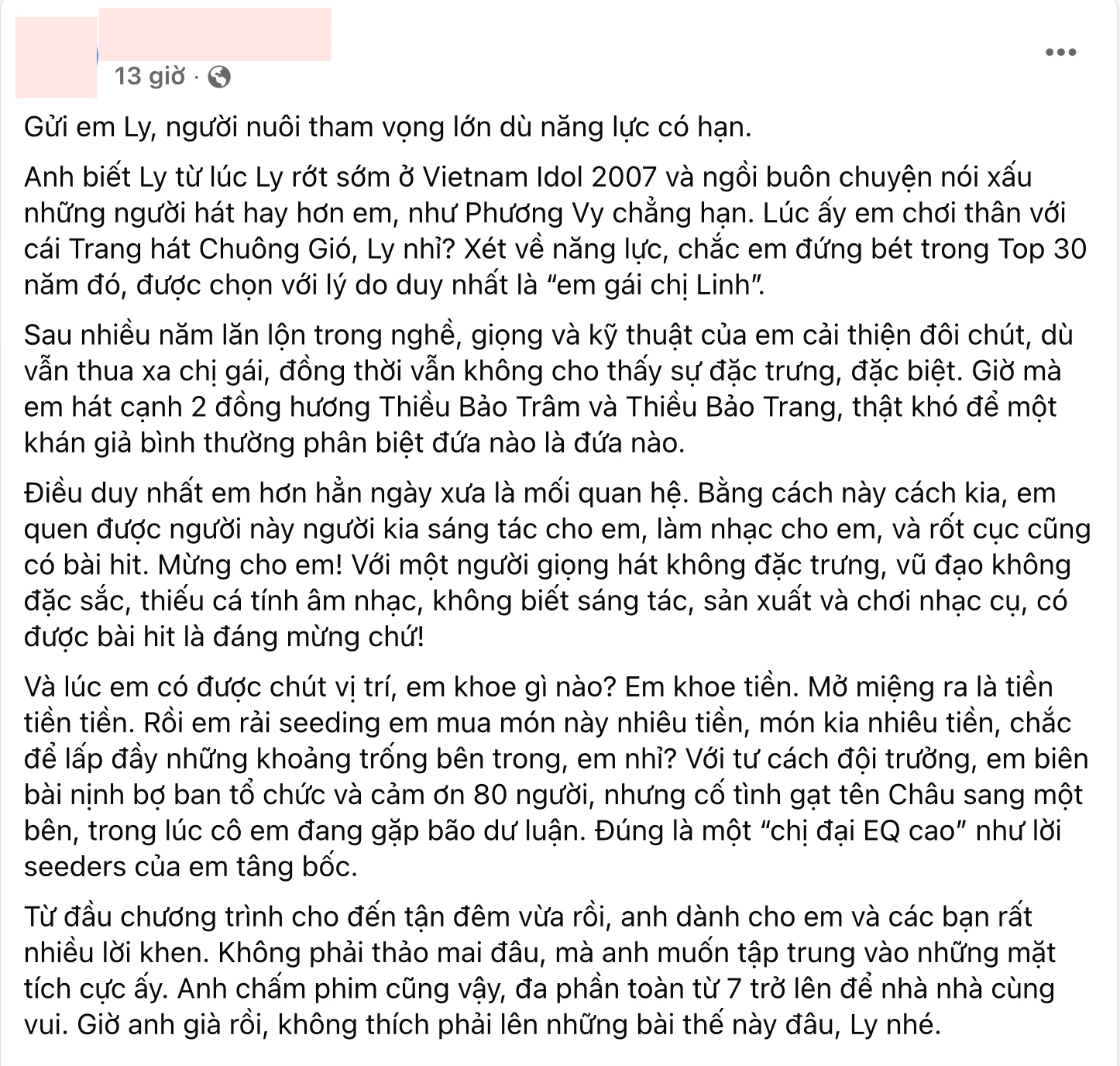 Theo nội dung đang lan truyền, "Ly" từng bị đánh giá là yếu nhất Vietnam Idol cả 2 mùa giải là 2007 và 2010, chỉ được chú ý nhờ danh xưng "em gái ca sĩ Phương Linh". Người này còn cho rằng sau khi bị loại, cô từng nói xấu các thí sinh mạnh như Phương Vy và Bích Phương. Dù sau nhiều năm hoạt động, giọng hát và kỹ thuật đã tiến bộ, nhưng cô vẫn bị nhận xét thiếu cá tính, không biết sáng tác hay chơi nhạc cụ, và có hit chủ yếu nhờ nhạc sĩ viết riêng.