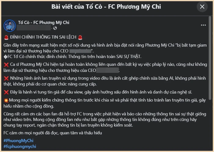 Alongside the attention given to her artistic activities and personal image, Phuong My Chi has also become the target of false information spread on social media.