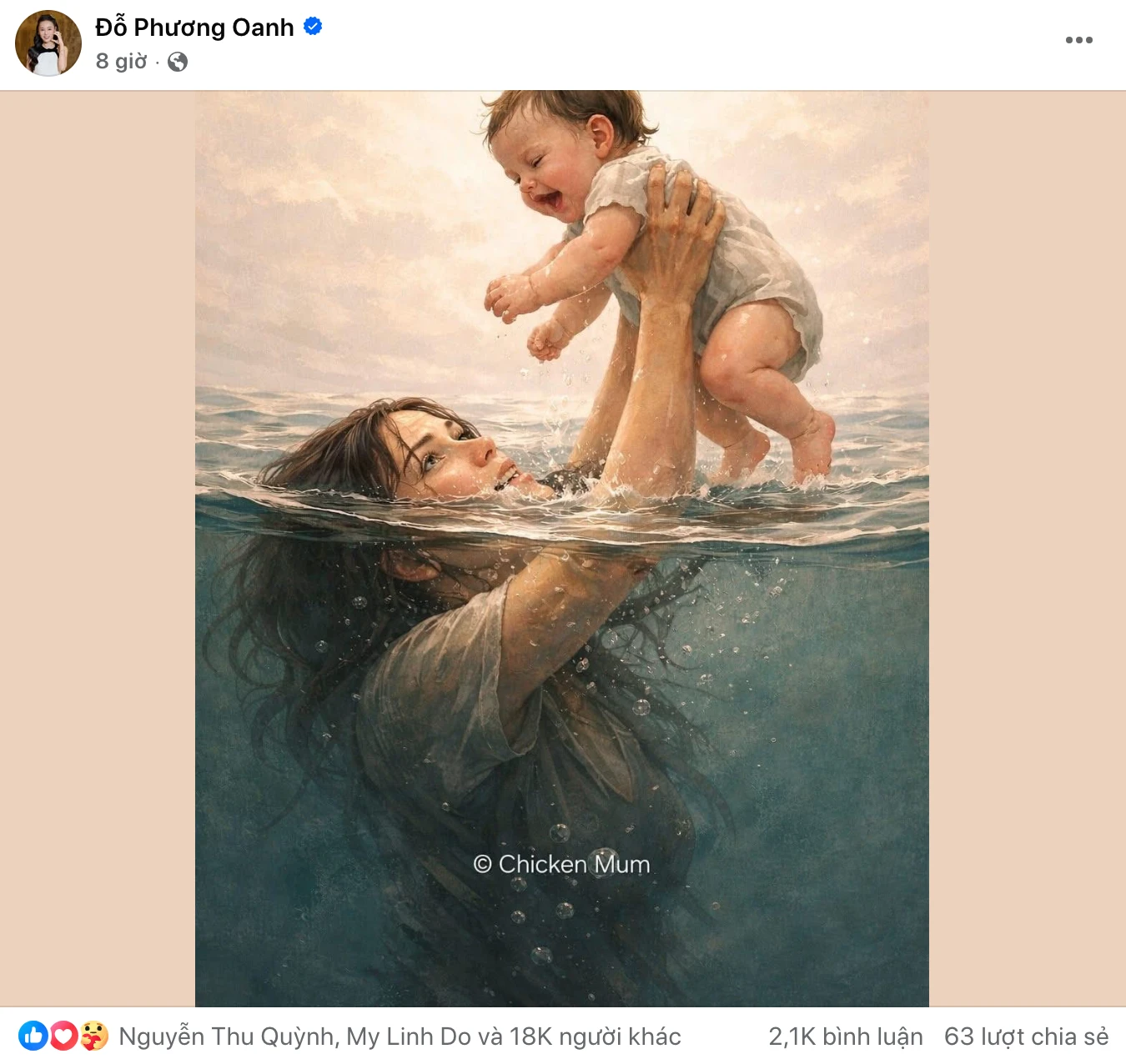 Trên trang cá nhân sở hữu hơn 760.000 lượt theo dõi, nữ diễn viên Phương Oanh mới đây đã chia sẻ một bức tranh vẽ mang nhiều tầng cảm xúc, khắc họa hình ảnh người mẹ dù bị làn nước nhấn chìm vẫn cố gắng vươn tay nâng đỡ, che chở cho con thơ. Không kèm theo bất kỳ dòng chú thích nào, nhưng chỉ riêng hình ảnh ấy cũng đủ khiến nhiều người lặng đi.