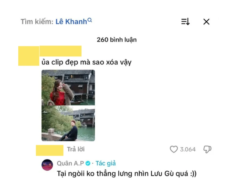 Most notably, the singer of "The Most Beautiful Flower" publicly interacted with a video clip. When a netizen questioned why the clip featuring Le Khanh had been deleted, Quan AP responded humorously: "Because she wasn't sitting straight, making her look too hunched over."
