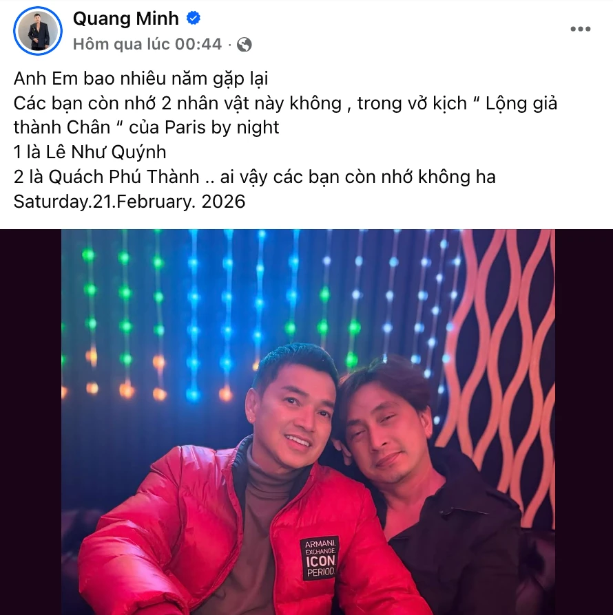 Ở chiều ngược lại, Quang Minh cũng có động thái gây bàn luận. Nam nghệ sĩ đăng tải hình ảnh chụp chung với một sao nam, đồng thời hồi tưởng lại những lần hợp tác trước đây với người này. Điều đáng nói là trong tiết mục mà anh nhắc đến, khán giả đều biết có sự xuất hiện của Hồng Đào. Dù bài đăng không trực tiếp nhắc đến vợ cũ, nhưng việc gợi lại kỷ niệm cũ vào đúng thời điểm nhạy cảm khiến nhiều người cho rằng anh đang gián tiếp gửi gắm thông điệp. Tuy nhiên, tất cả cũng chỉ dừng ở mức suy đoán từ cộng đồng mạng bởi bản thân Quang Minh không có chia sẻ cụ thể nào liên quan đến Hồng Đào trong bài viết đó.