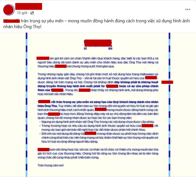 By the evening of the same day, a famous milk brand in Vietnam issued an official statement, affirming that the photo series was not a communication activity of the company. The brand emphasized: "Mr. Tho is our special image, not related to horror or Halloween content. The use of this character must be clearly licensed to ensure respect for intellectual property rights and to maintain a consistent brand image."