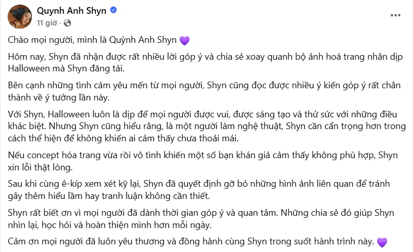 In response to the wave of public reaction and the move from the above brand, Quynh Anh Shyn posted an apology on her personal page. She wrote: "Shyn has received a lot of comments and shares surrounding the Halloween costume photo set. If the recent costume concept unintentionally made some viewers feel inappropriate, Shyn sincerely apologizes." She said that she and her team reviewed it and decided to remove all related images to avoid causing more misunderstandings or unnecessary debate. "Those shares help Shyn look back, learn and improve herself every day," she added.