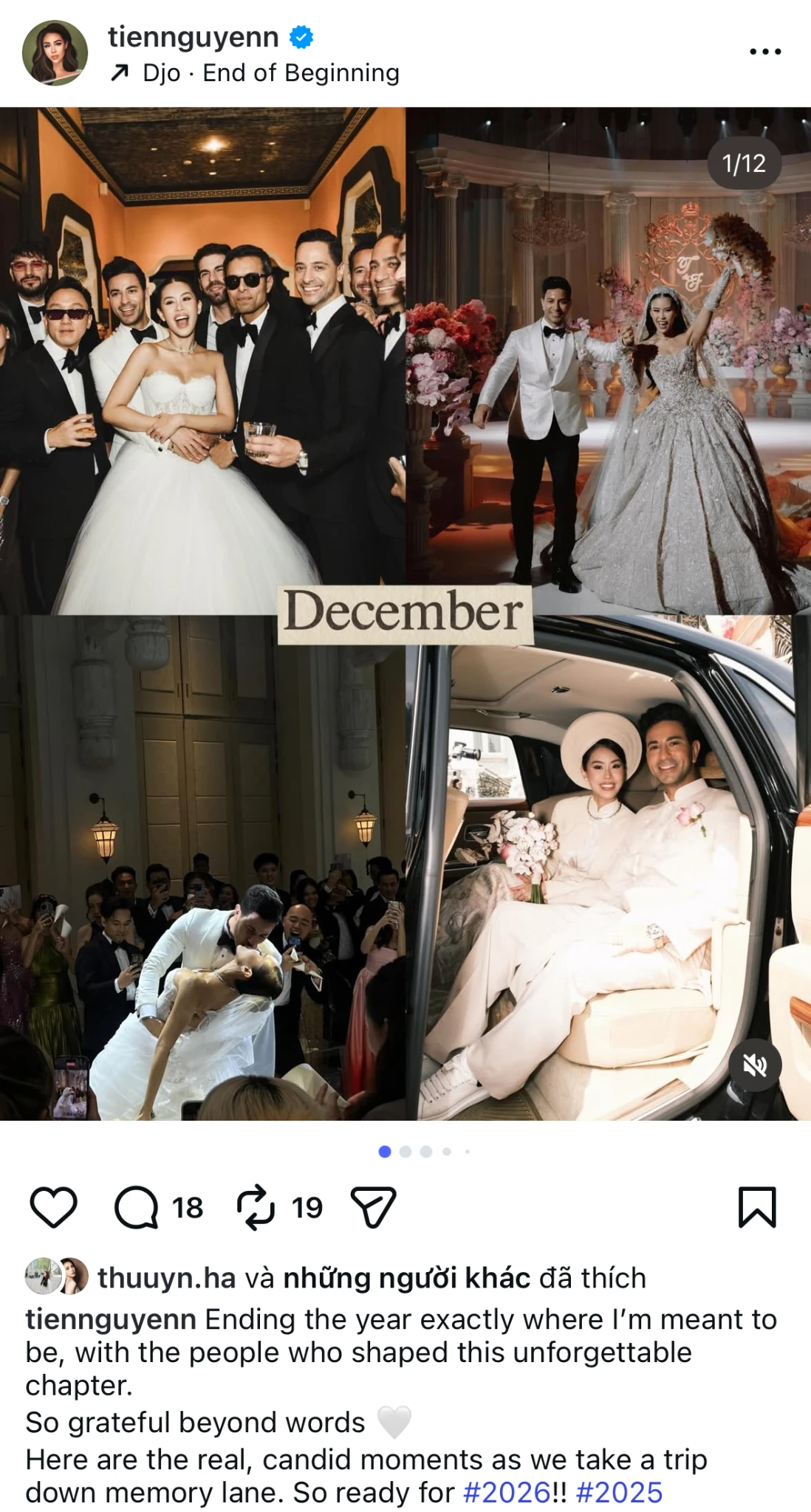 Khép lại một năm đầy biến động, Tiên Nguyễn đã đăng tải loạt ảnh tái hiện hành trình 12 tháng đáng nhớ với dòng trạng thái đầy cảm xúc: "Khép lại một năm đúng nơi tôi thuộc về, bên những con người đã tạo nên một chương không thể quên". Xuyên suốt bộ ảnh, công chúng dễ dàng bắt gặp những khoảnh khắc ngọt ngào của cô bên cạnh chồng, cùng sự xuất hiện dày đặc của các thành viên trong gia đình tỷ phú Johnathan Hạnh Nguyễn. Từ những bữa tiệc sang trọng đến các hoạt động thể thao đời thường, Tiên Nguyễn cho thấy một cuộc sống viên mãn cả về sự nghiệp lẫn tình cảm.