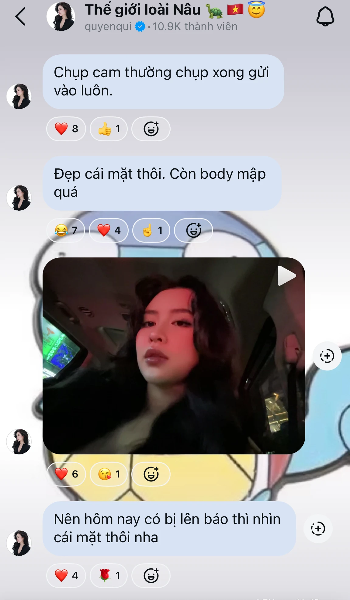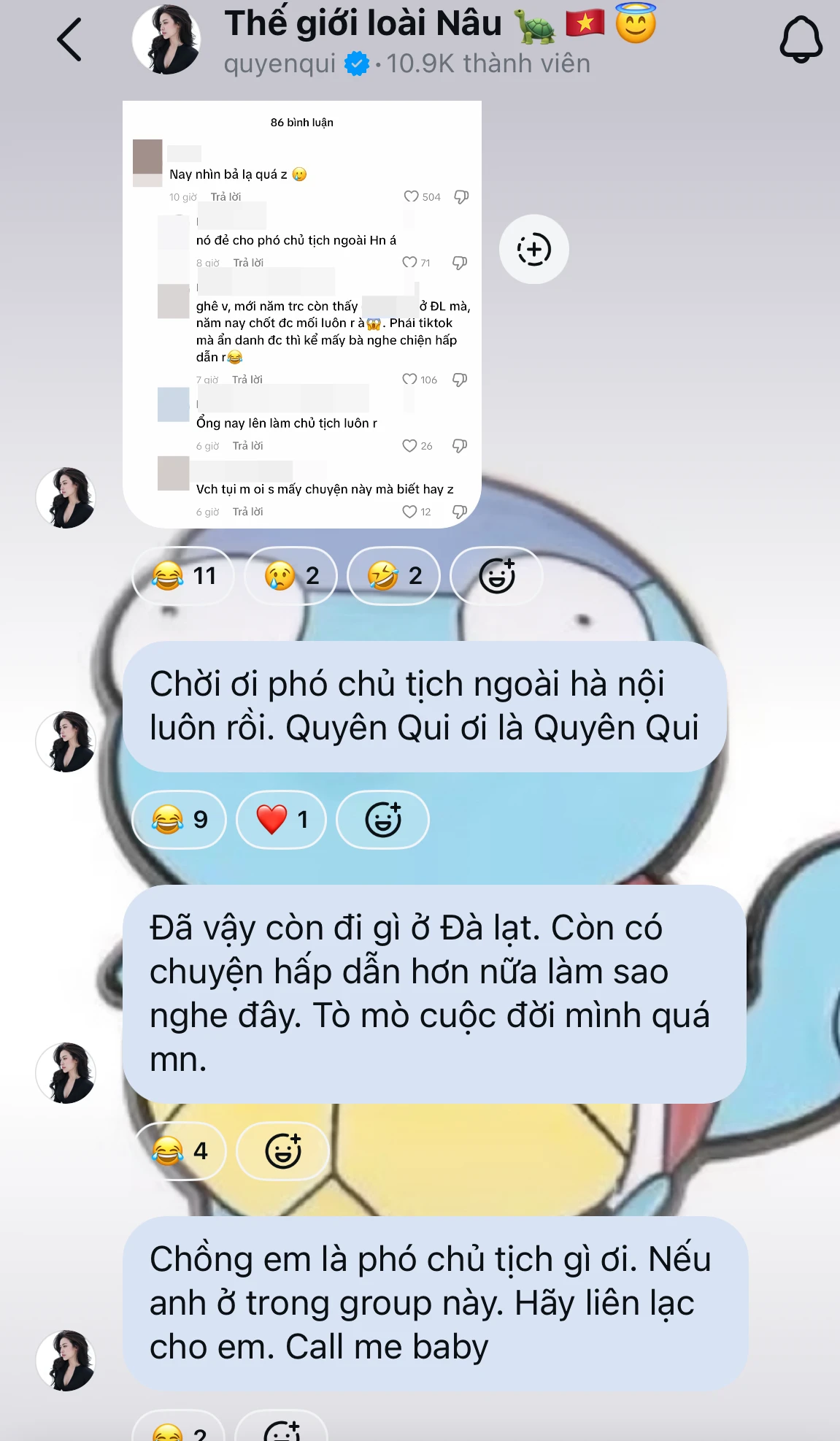 Mới đây nhất, sau khi đọc các bình luận hậu sự kiện, Quyên Qui tiếp tục lên tiếng. Cô nàng thẳng thắn phản bác luôn vào những tin đồn không đúng về mình. Khi bị cư dân mạng nói cô đã sinh con cho một vị phó chủ tịch, người đẹp lập tức đáp trả: "Trời ơi, phó chủ tịch ngoài Hà Nội luôn rồi. Quyên Qui ơi là Quyên Qui. Đã vậy còn gì đó ở Đà Lạt, còn có chuyện hấp dẫn hơn nữa làm sao nghe đây. Tò mò cuộc đời mình quá mọi người".