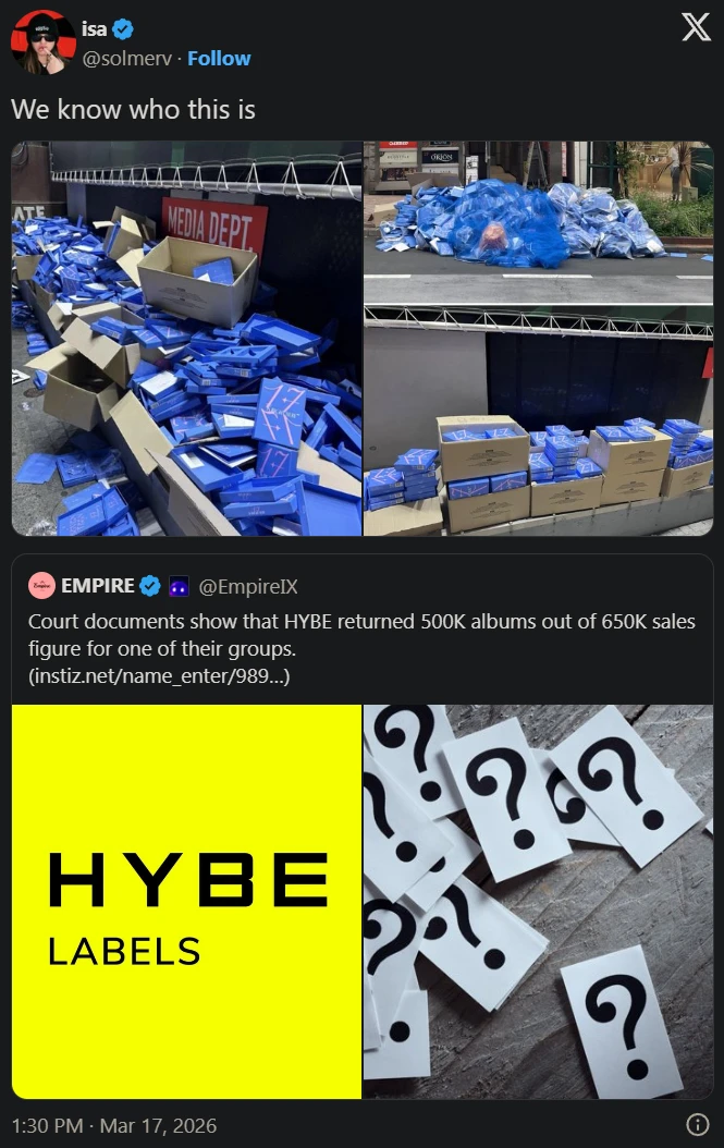 Nguồn cơn của vụ việc bắt nguồn từ các tài liệu tòa án được công bố gần đây, hé lộ những góc tối trong chiến lược kinh doanh của tập đoàn HYBE. Theo đó, một nhóm nhạc giấu tên trực thuộc tập đoàn bị cáo buộc đã ghi nhận doanh số ảo lên tới 650.000 bản, nhưng thực tế có đến 500.000 album bị hoàn trả sau đó. Con số chênh lệch khổng lồ này đã làm dấy lên nghi vấn về hành vi "thổi phồng" doanh số để tạo hiệu ứng truyền thông và thao túng các bảng xếp hạng âm nhạc.