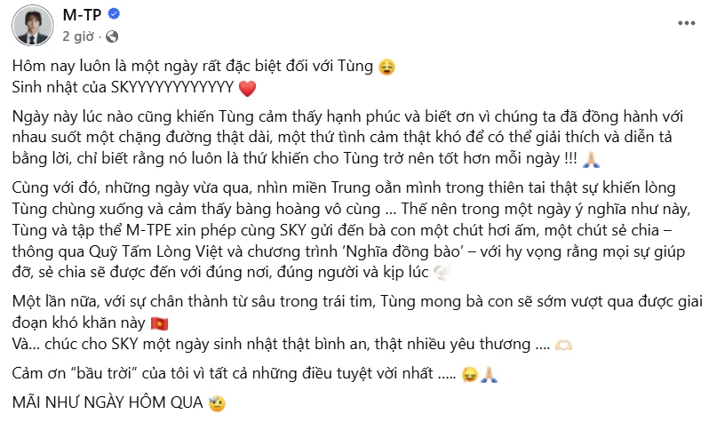 Trên trang cá nhân, giọng ca Chúng ta của hiện tại viết: "Những ngày vừa qua, nhìn miền Trung oằn mình trong thiên tai thật sự khiến lòng Tùng chùng xuống và cảm thấy bàng hoàng vô cùng. Thế nên trong một ngày ý nghĩa như thế này, Tùng và tập thể M-TPE xin phép cùng SKY gửi đến bà con một chút hơi ấm, một chút sẻ chia thông qua Quỹ Tấm lòng Việt và chương trình Nghĩa đồng bào với hy vọng rằng mọi sự giúp đỡ, sẻ chia sẽ được đến đúng nơi, đúng người và kịp lúc. Với sự chân thành từ sâu trong trái tim, Tùng mong bà con sớm vượt qua giai đoạn khó khăn này. Và chúc SKY mãi là bầu trời của yêu thương, của bình an và những điều tốt đẹp nhất."
