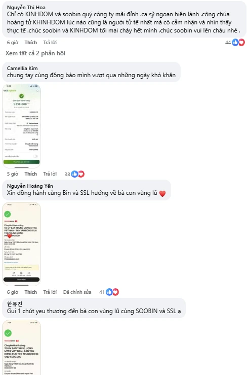 Các khán giả đã để lại nhiều bình luận đầy tự hào và xúc động. Một người viết: "Fan và idol nhà mình cứ thế thôi", trong khi người khác nhắn nhủ: "Nghĩa cử cao đẹp. Chúc concert của SOOBIN diễn ra vào ngày mai thành công rực rỡ nhé." Những lời động viên này không chỉ thể hiện tình cảm dành cho thần tượng mà còn cho thấy sự đồng lòng của cộng đồng fan trong việc lan tỏa tinh thần tương thân tương ái.