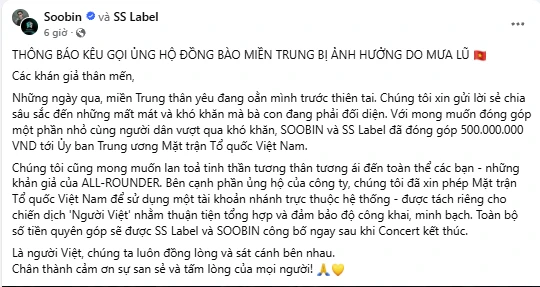 Trên trang cá nhân, Soobin đã chia sẻ những lời chân thành gửi đến khán giả: "Những ngày qua, miền Trung thân yêu đang oằn mình trước thiên tai. Chúng tôi xin gửi lời sẻ chia sâu sắc với những mất mát và khó khăn mà bà con đang phải đối diện. Với mong muốn đóng góp một phần nhỏ cùng người dân vượt qua khó khăn, SOOBIN và SS Label đã đóng góp 500.000.000 VND tới Ủy ban Trung ương Mặt trận Tổ quốc Việt Nam." Lời nhắn này nhanh chóng lan tỏa, nhận được sự đồng cảm và hưởng ứng mạnh mẽ từ cộng đồng người hâm mộ.