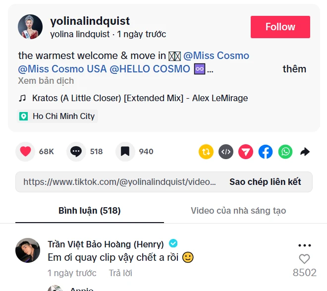 Lan Chi16:03:09 23/12/2025Chỉ hai ngày sau đăng quang Miss Cosmo 2025, Yolina Lindquist đã khiến khán giả Việt thích thú khi bày tỏ mong muốn gắn bó lâu dài với Việt Nam. Từ áo dài, ẩm thực đến Tết cổ truyền, nàng hậu người Mỹ cho thấy sự hòa nhập nhanh hiếm thấy.