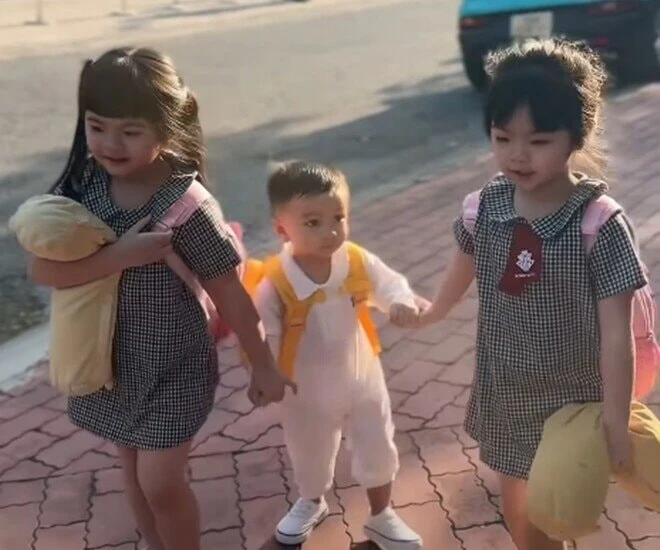 Nữ diễn viên Vân Trang cũng vừa chia sẻ hành trình đưa con trai út - bé Quintin (Tin) - lần đầu đi học. Hình ảnh gây ấn tượng mạnh nhất với khán giả là cảnh hai chị gái song sinh Quinanna và Quinita nắm tay dắt em trai qua cổng trường. Sự gắn kết giữa các con là niềm tự hào lớn đối với gia đình nữ diễn viên.