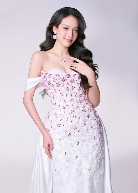 Designer Le Thanh Hoa shared about the design: "Inspired by cherry blossoms, the "Sakura Grace" ao dai design recreates the fragile, pure but vibrant beauty of Japanese spring. The design is recreated using sophisticated surface treatment techniques and thousands of hand-sewn beads and crystals. Each petal seems to gently rotate in the wind, creating a sparkling movement effect with each step of the beauty queen."