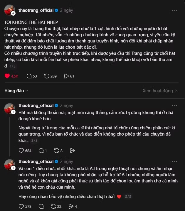 Trong bài đăng cá nhân, Thảo Trang không né tránh mà nói thẳng: "Tôi không thể hát nhép", đồng thời ví việc này như một "cực hình" đối với những người đi hát chuyên nghiệp. Nữ ca sĩ cho biết mỗi lần biểu diễn, cảm xúc và cách xử lý ca khúc đều thay đổi, nên việc phải khớp hoàn toàn với bản thu âm là điều gần như không thể. Không chỉ là vấn đề kỹ thuật, cô còn nhấn mạnh cảm giác thiếu chân thật khi đứng trên sân khấu mà không được cất giọng thật của mình. Với Thảo Trang, điều đó khiến cô "xấu hổ với bản thân và khán giả", nhất là trong những tình huống bị quay cận mặt.