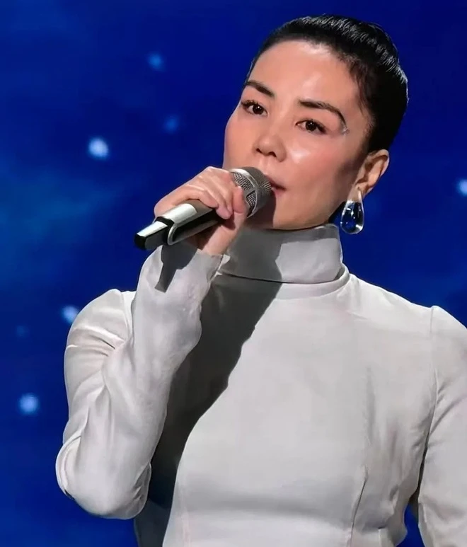 On stage, Faye Wong performed the song "Moments We've Shared" with an elegant and demure style, complemented by subtle makeup. Despite her brief appearance, she captivated everyone's attention with her calm demeanor and distinctive voice.