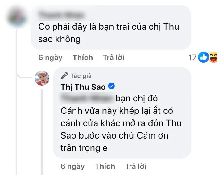 Tin đồn bắt nguồn từ việc cô Thu Sao đăng tải hình ảnh chụp cùng một chàng trai lạ mặt lên trang cá nhân. Ngay lập tức, bức ảnh thu hút sự chú ý và kéo theo hàng loạt bình luận tò mò về mối quan hệ của cả hai. Trước những thắc mắc của netizen, khi có người hỏi liệu đây có phải là bạn trai mới hay không, cô Thu Sao thẳng thắn đáp lại: "Bạn chị đó, cánh cửa này khép lại ắt có cánh cửa khác mở ra đón Thu Sao bước vào chứ".
