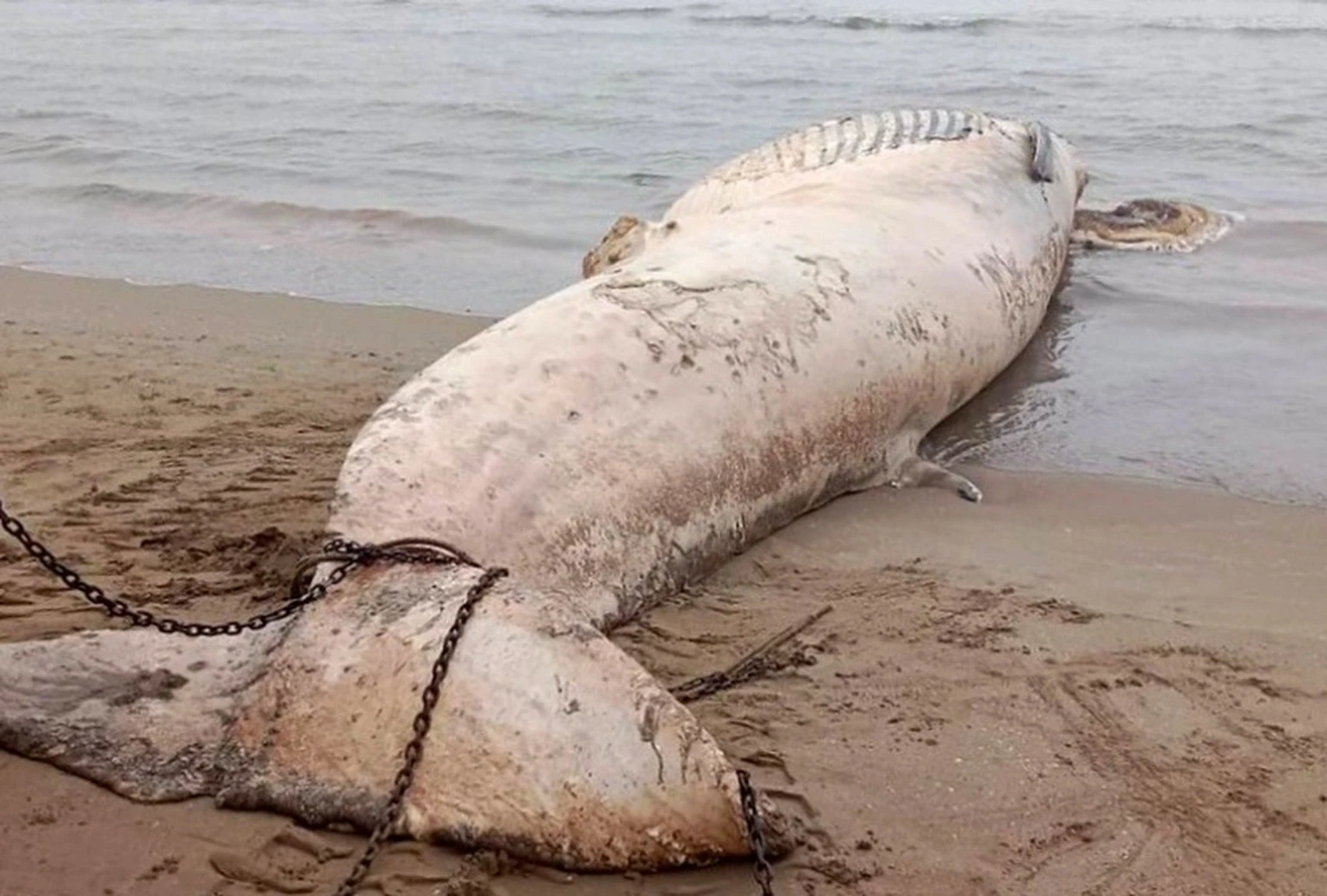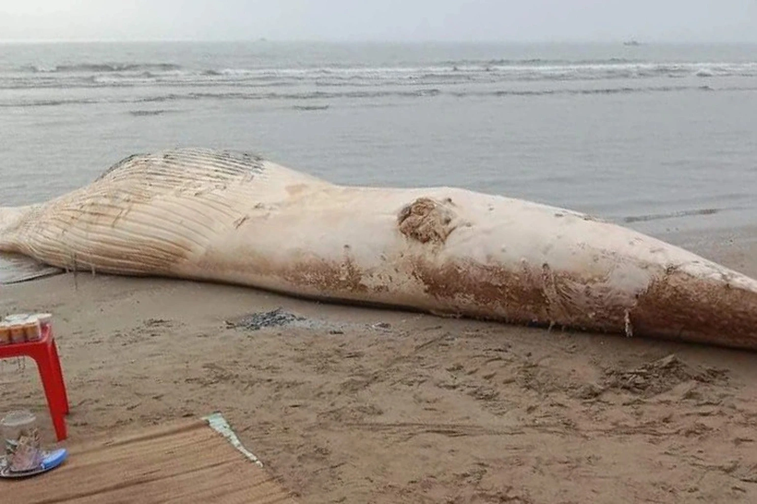 The incident began on March 4, when fishermen at the Dongyifa fixed net fishing ground suddenly discovered a huge object trapped in the fishing net system. When they got closer, they all were shocked to realize that it was the carcass of a whale that was longer than a big bus. According to the coast guard's records, this individual has been lost before and is in the process of strong decomposition. Due to the gas that accumulates inside the body, the whale carcass swells like a giant ball, creating a spectacle that is both majestic and terrifying.