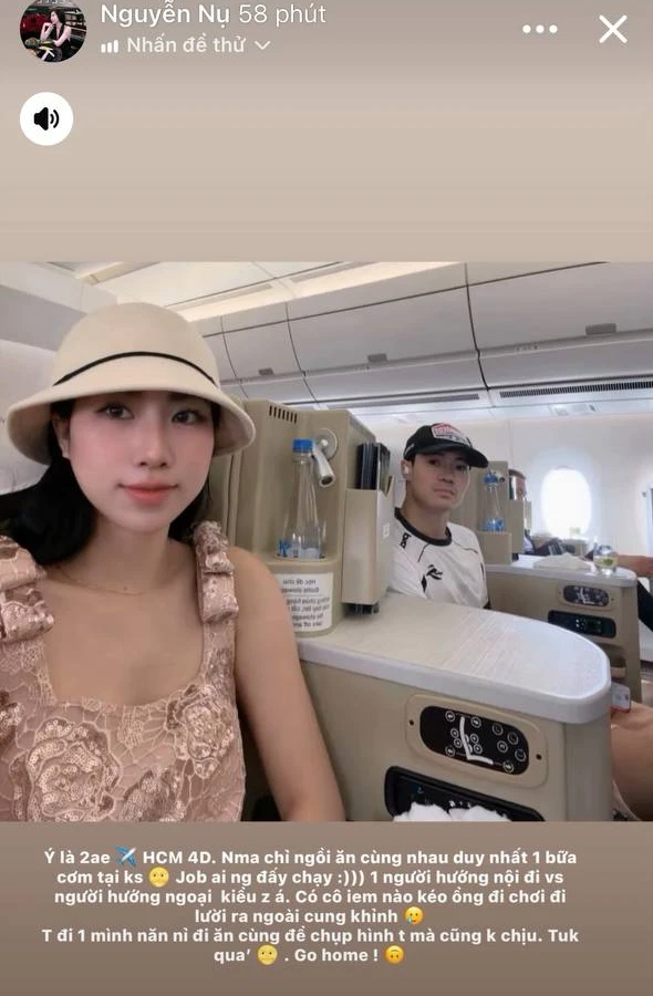 The incident originated from a recent business trip between Ho Chi Minh City. Ho Chi Minh City and Hanoi of Van Toan. Instead of taking advantage of his free time to explore the city with his relatives, this striker chose to "hide" in the hotel. Nguyen Nu, with his lively and outgoing personality, felt helpless in the face of this difference. On her personal page, the hottest sister in football shared a photo of the two brothers sitting next to each other on the plane, accompanied by a witty lament. She said that, although she had four days in Ho Chi Minh City. But the two brothers only shared one meal at the hotel. "It means that 2 brothers stayed in Ho Chi Minh City for 4 days, but only ate 1 meal together at the hotel. Everyone runs jobs, 1 introvert goes with an extrovert like that. There are some sisters who drag him out to play, terribly lazy to go out," Nguyen Nu wrote.