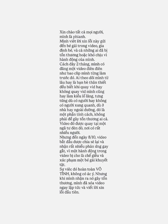 In the post, Phi Anh expressed: "I sincerely apologize to the girl in the video, her family and everyone who feels hurt by her thoughtless actions." He explained that the clip, which was filmed about two months ago, was "improvised, without bad intentions".