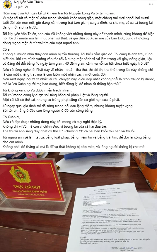 Tối 29/10, Nguyễn Văn Thiên – người từng gây ồn ào trong vụ việc tại quán cà phê phường Vĩnh Tuy ( Hà Nội ) – bất ngờ đăng tải một dòng trạng thái dài trên trang cá nhân, gửi đến mẹ của đương sự bị hành hung. Trong bài viết, Thiên bày tỏ sự đồng cảm với nỗi đau của một người mẹ khi con bị tổn thương, đồng thời kêu gọi sự tha thứ: "Tôi hiểu cảm giác khi con mình bị tổn thương, tôi cũng có em. Nhưng một hành động sai lầm trong vài giây liệu có đáng để đánh đổi bằng 40 ngày tạm giam lạnh lẽo, xa gia đình, xa cha mẹ và xa cả tương lai không? Nếu cô từng nghe lời Phật dạy thì tôi tin tha thứ trong lúc này không chỉ là cứu một chàng trai, mà là cứu luôn một nhân cách, một cuộc đời."