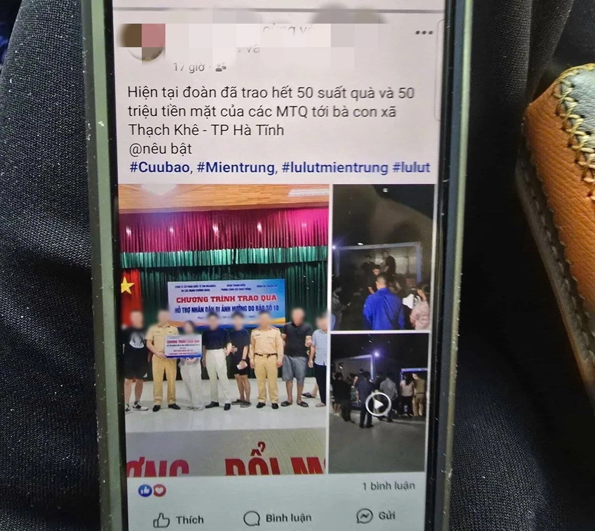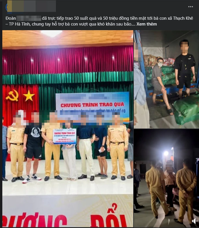 Mới nhất trên trang cá nhân, người này viết: "Hiện tại đoàn đã trao hết 50 phần quà và 50 triệu tiền mặt của các mạnh thường quân tới bà con xã Thạch Khê - Hà Tĩnh".