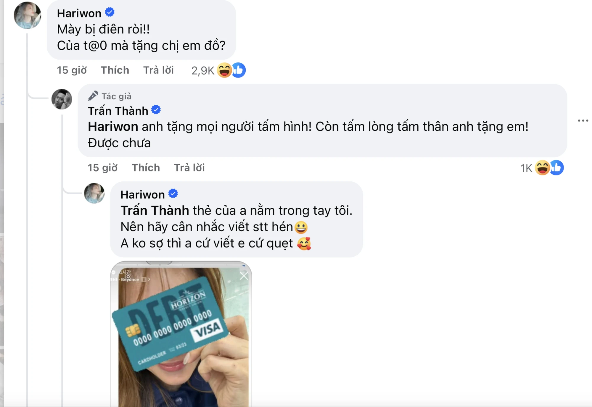 It seemed like a happy wish like many times, but Hari Won turned her husband's post into a lovely public display of jealousy. The female singer quickly appeared, questioning Tran Thanh with a powerful statement, proving her monopoly on her famous husband: "Are you crazy, what's mine is giving to my sisters?". She also threatened financially by swiping her husband's bank card.