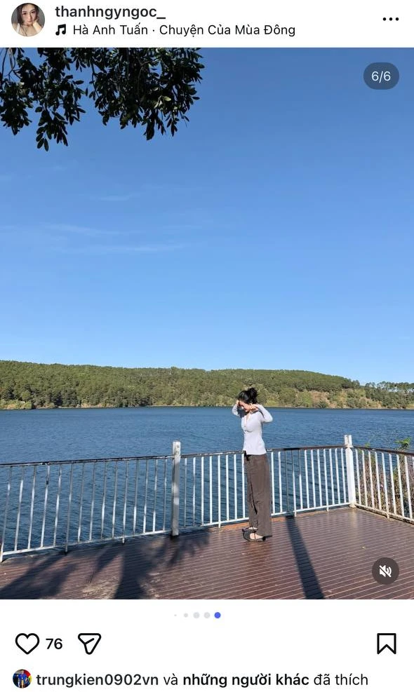 Chưa dừng lại ở đó, phía "đàng gái" cũng có động thái khiến netizen không thể làm ngơ. Nguyễn Ngọc Thiên Thanh đăng tải hình ảnh check-in giữa khung cảnh thiên nhiên quen thuộc, diện đúng bộ trang phục từng xuất hiện trong bức ảnh chung với Trung Kiên. Đáng chú ý, chàng thủ môn U23 Việt Nam nhanh chóng thả tim tương tác, như một cách ngầm khẳng định sự liên quan. Chi tiết nhỏ này nhưng lại được cư dân mạng đánh giá là "quá đủ hiểu".