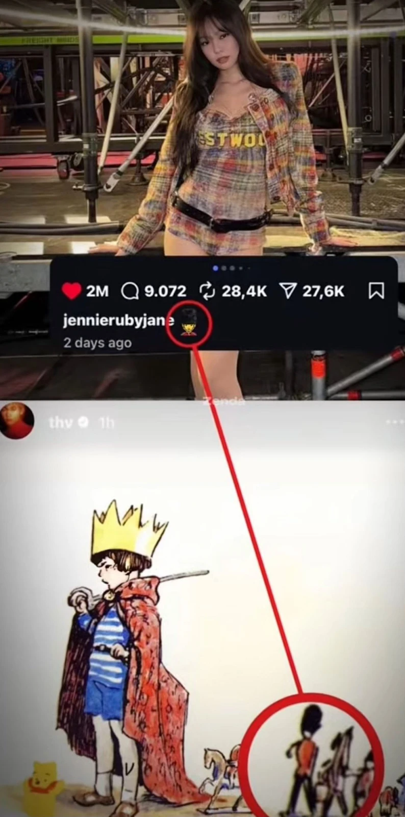 Không lâu sau, Jennie cũng có động thái được cho là "phản hồi" V. Cô đăng tải loạt ảnh concert DEADLINE tại London kèm emoji lính gác Hoàng gia Anh. Dù emoji này phổ biến để ám chỉ nước Anh, nhưng khi đặt cạnh bức ảnh V đăng chú gấu Winnie the Pooh cùng tạo dáng tương tự, nhiều fan suy đoán rằng cả hai đang trao đổi tín hiệu ngầm với công chúng.