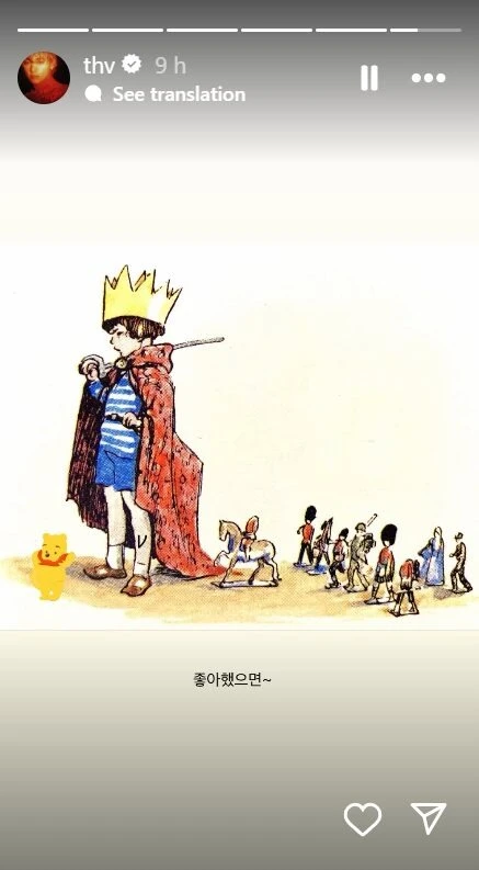 Mới đây, V bất ngờ đăng hình ảnh minh họa chú gấu Winnie the Pooh trong cuốn sách When We Were Young của AA Milne. Nếu chỉ là một bức ảnh đơn giản, có lẽ chẳng ai quan tâm. Tuy nhiên, dân mạng nhanh chóng nhận ra chi tiết đặc biệt: chú gấu trong ảnh V đăng trùng với chú gấu từng xuất hiện trong "áo đôi" của cặp đôi khi còn hẹn hò, thậm chí dáng đứng và cách tạo dáng cũng giống hệt. Sự trùng hợp này khiến fan tin rằng V đang ngầm gửi thông điệp về mối quan hệ với Jennie.