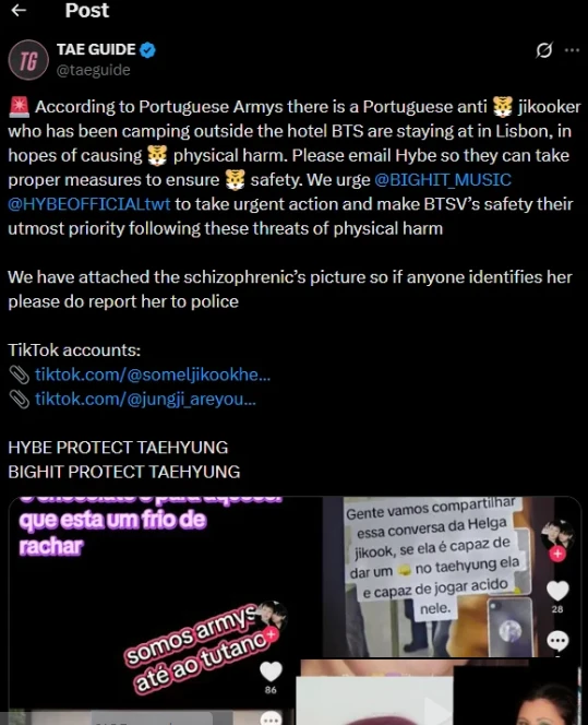 Trước tình hình đó, các hashtag như "#HYBEPROTECTTAEHYUNG" và "#BIGHITPROTECTTAEHYUNG" nhanh chóng leo top trên nền tảng X (Twitter). Hàng nghìn ARMY đồng loạt kêu gọi HYBE và BIGHIT MUSIC phải lập tức vào cuộc, coi sự an toàn của Taehyung là ưu tiên số một. Không ít người cho biết họ đã chủ động liên hệ với cảnh sát Bồ Đào Nha để báo cáo, vì lo ngại đây không chỉ là vấn đề của một nghệ sĩ mà còn có thể ảnh hưởng đến an ninh công cộng.