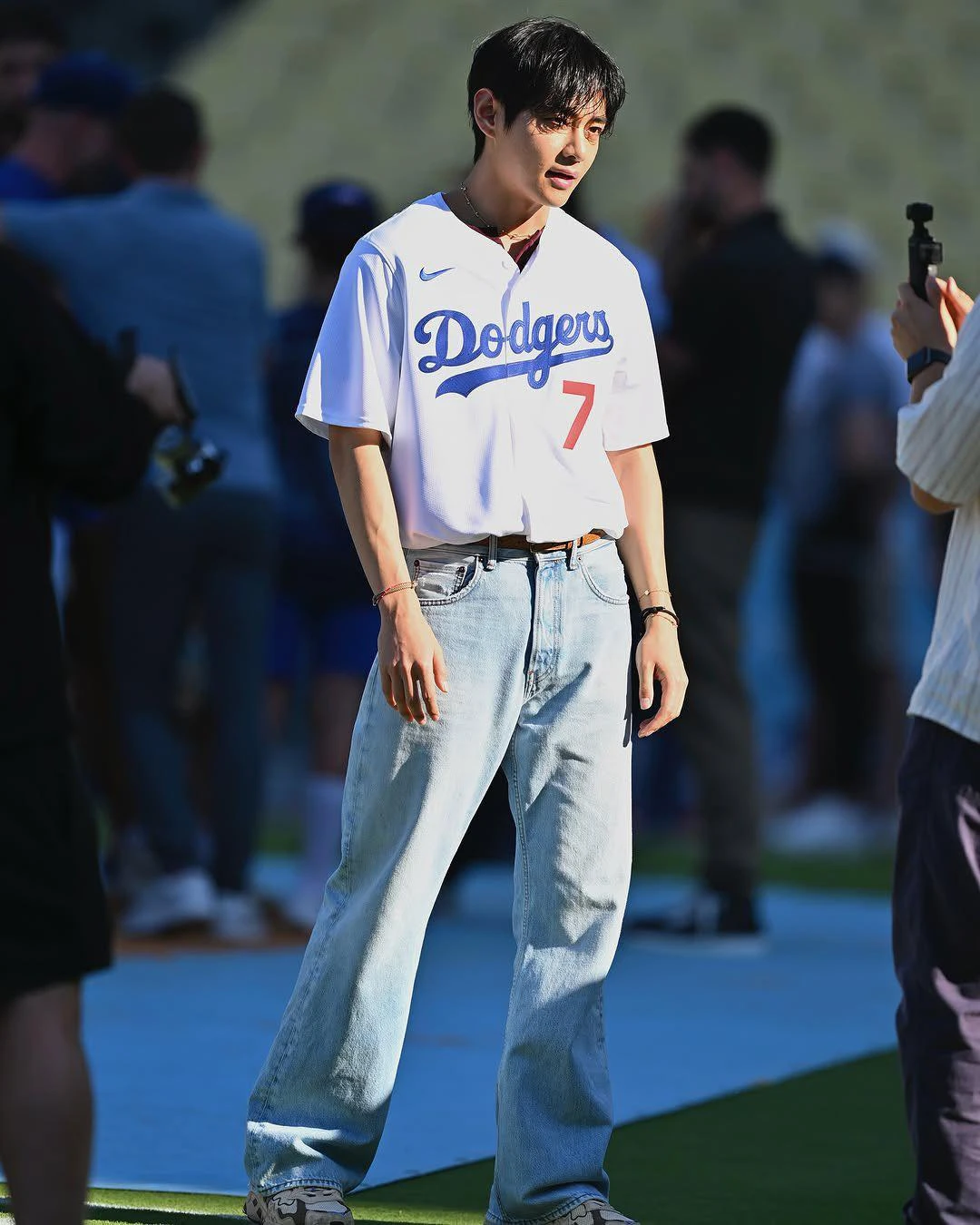 At the event, V successfully threw a left-handed strike that made the stadium explode, making his fans extremely happy. Before making the opening throw, the BTS member had a gap frame (a term that refers to the difference in size between two people) while listening to instructions from Dodgers pitcher Glasnow. It can be said that fans have never seen the 1.8 meter tall handsome guy V so small and cute.