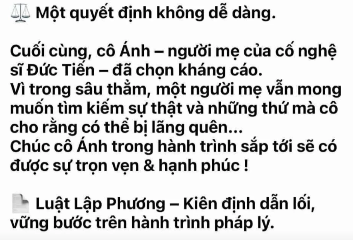 This person wrote: "A decision not easy. In the end, Ms. Anh - the mother of the late artist Duc Tien - chose to appeal. Because deep down, a mother still wants to find the truth and things that she thinks can be forgotten... Wish Ms. Anh in the upcoming journey will have completeness and happiness!"