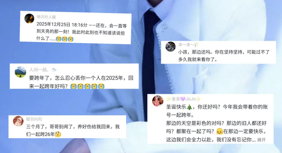 After a long period of inactivity, the comments section on the late artist Yu Menglong 's Douyin account unexpectedly reopened on December 24th, quickly becoming a place where fans could express their longing, wishes, and hopes that he wouldn't be alone in 2025.