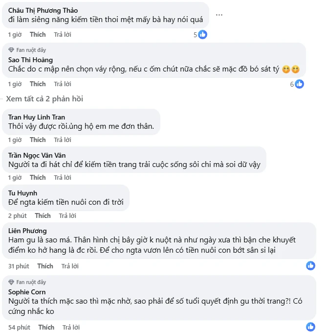 On social networks, the comments clearly reflect the division in perception. Some people think that "go to work diligently to make money, you are tired of talking too much", as a message to let artists be free to pursue their work. Others expressed sympathy for her plight, as both an artist and a single mother, needing support rather than criticism. However, there are also frank opinions that advise that if the physique is no longer as slim as it used to be, you should choose clothes that conceal your flaws, avoid flared skirts that make your body look bigger.