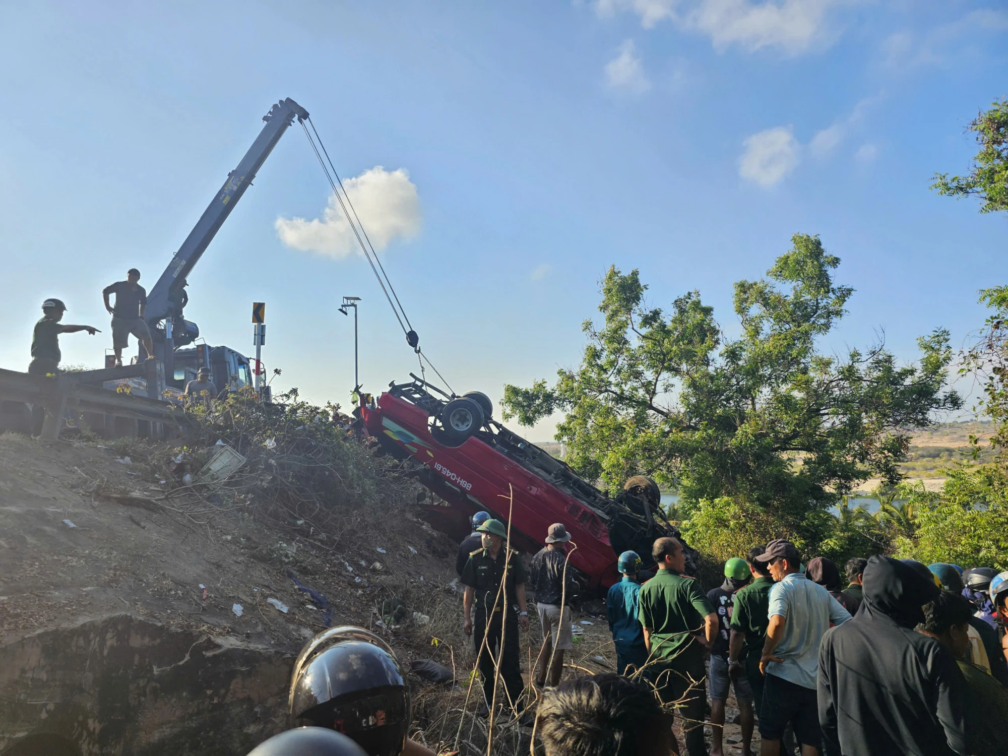 At about 15:30 on April 6, the peaceful atmosphere in Hong Lam village, Hoa Thang commune (Bac Binh district) was broken by a terrifying noise. The passenger car bearing the control plate 86H-054.61, driven by driver Tran Thanh Son in the direction of Mui Ne to Tuy Phong, suddenly deviated from its orbit, plunged to the deep edge of the ground and overturned. At the scene, the car was completely deformed in the middle of the abyss, the boundary between life and death had never been so fragile.