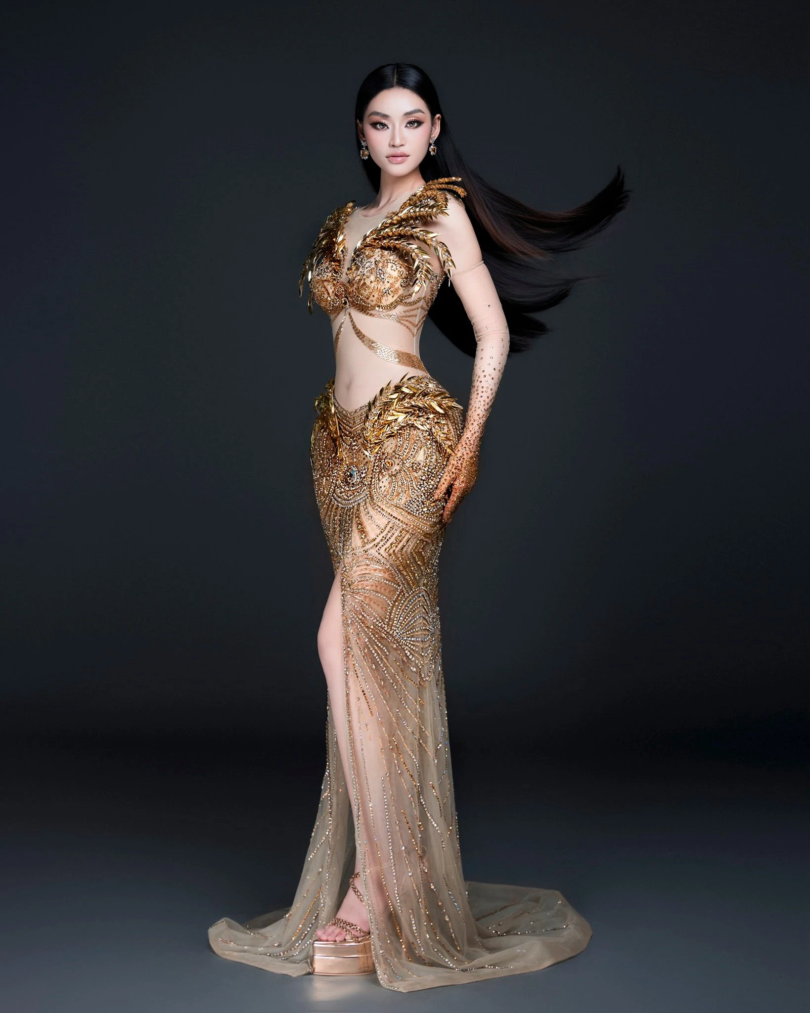It is known that the evening gown that Yen Nhi chose for the most important competition is called "Hoang Giap - The Golden Warrioress". The design was inspired by the image of Vietnamese female warriors, made with the main metallic gold tone, transparent material and bold cuts to help highlight the beauty's figure.